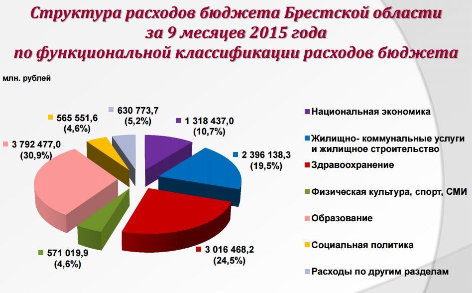 В структуре расходов областного бюджета больше всего средств расходовалось на социальную сферу. Так, на сайте облисполкома приводится инфографика об исполнении бюджета за 9 месяцев 2015 года, на образование потрачено 30,8% средств, здравоохранение — 25,4%, жилищно-коммунальные услуги и жилищное строительство — 19,5%.