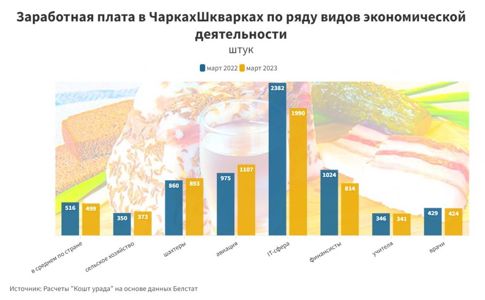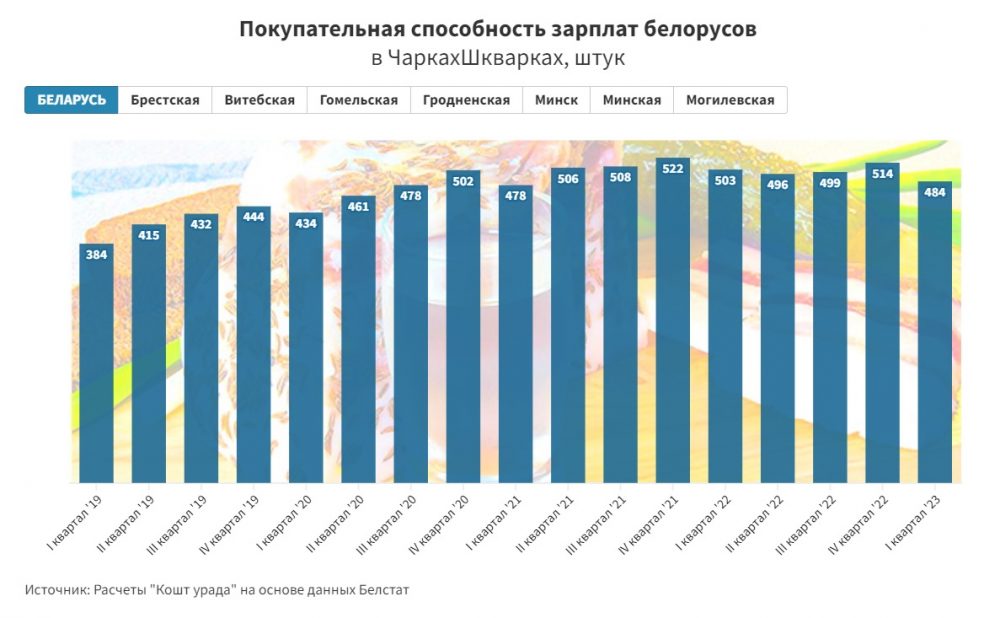 В первом квартале 2023 года этот показатель составляет 484 чарки и шкварки (при стоимости одной ЧШ 3 рубля 57 копеек). Для сравнения: в марте прошлого года средняя зарплата по стране составляла 503 ЧШ, то есть она была на 19 ЧШ больше, чем сейчас.