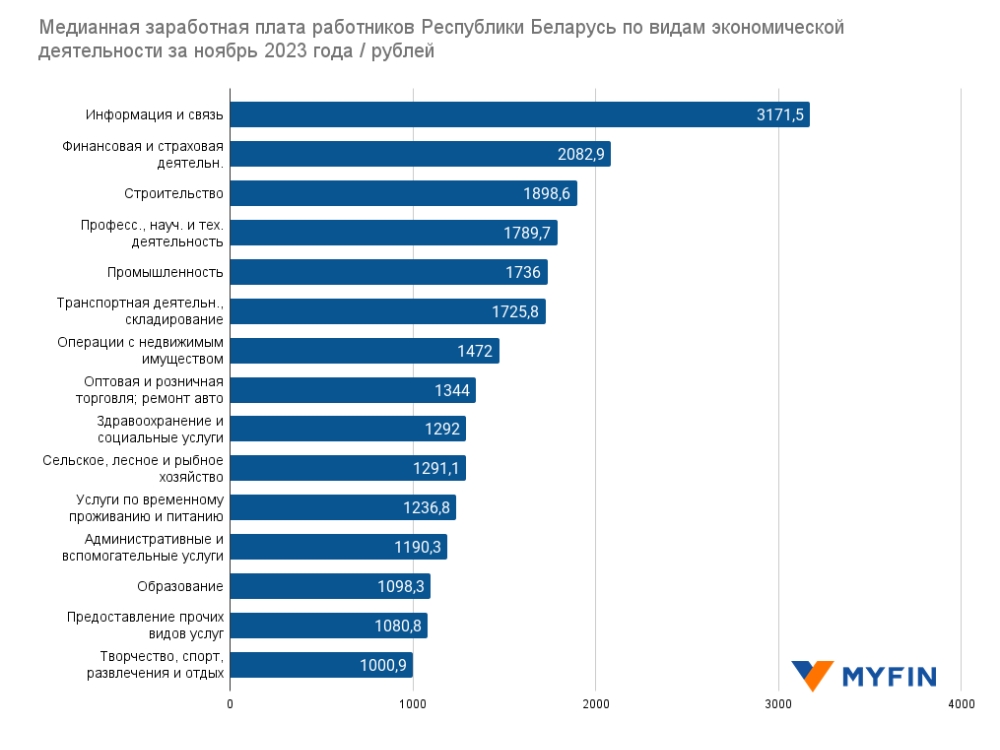 Национальный статистический комитет опубликовал информацию о медианной зарплате работников Беларуси по видам экономической деятельности. По информации Белстата, медианная зарплата в Беларуси в ноябре 2023 года составила 1499,5 руб. (около $483— ред.). Для сравнения: в ноябре 2022 года показатель был на уровне 1248,1 руб. (около $619 — ред.).