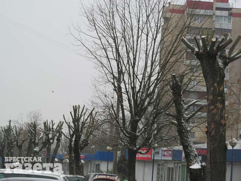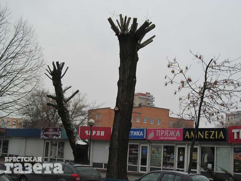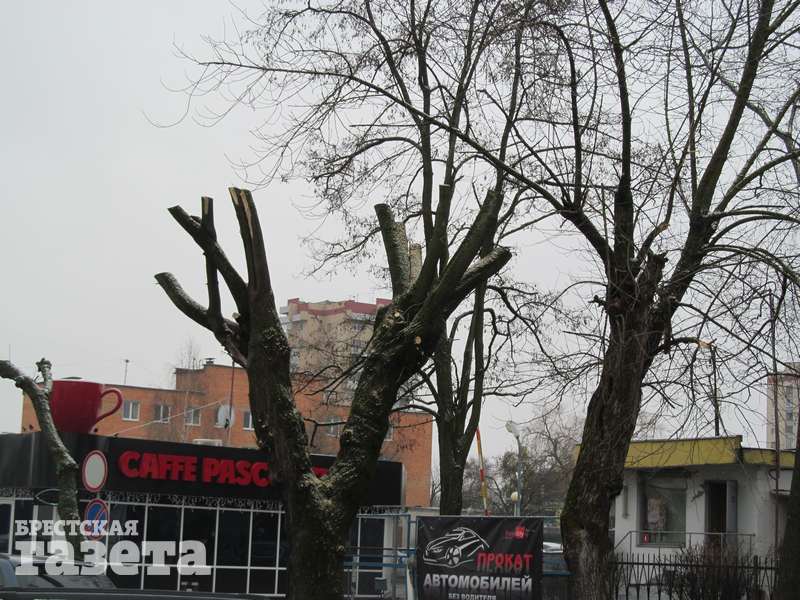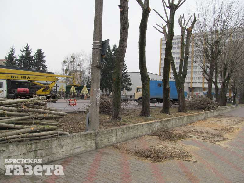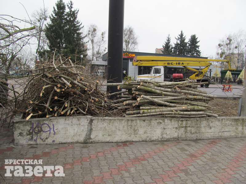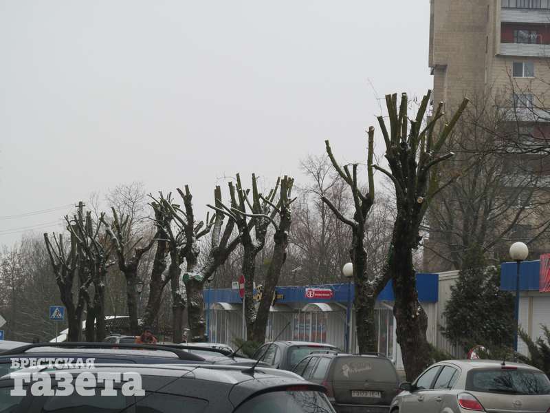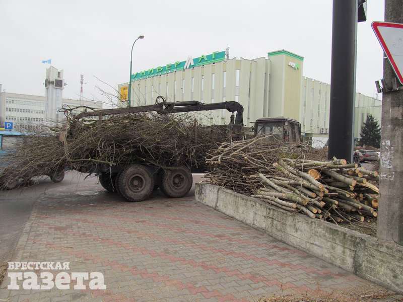 А на следующий день пришел черед и деревьев, растущих рядом с парковкой возле «Интуриста». На месте работ в 12.30 корреспондент «БГ» увидел, четыре свежеобрезанных дерева. Часть срезанных мелких веток уже была сложена в прицеп для перевозки леса с манипулятором, другие еще лежали возле деревьев — ждали своей очереди. Более толстые части ветвей были сложены возле дороги. Еще шесть деревьев растущих неподалеку оставались с нетронутыми кронами.