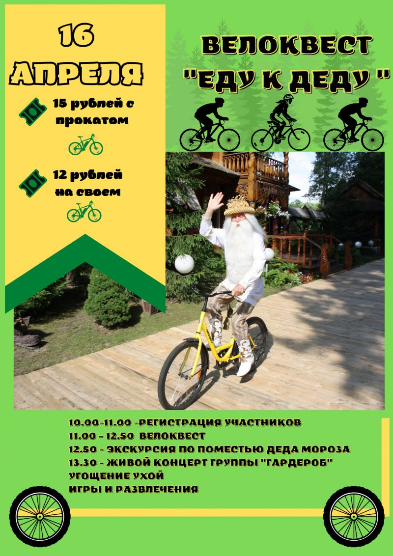 Велоквест «Еду к деду» пройдет 16 апреля и рассчитан ориентировочно на два часа. Сбор намечен на 10.00. Затем участники побывают с экскурсией в поместье Деда Мороза, смогут угоститься ароматной ухой и другими пущанскими лакомствами. Об этом сообщает сайт нацпарка.