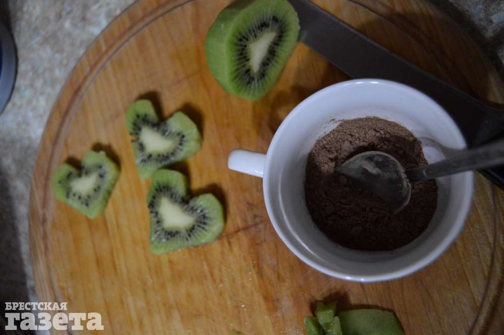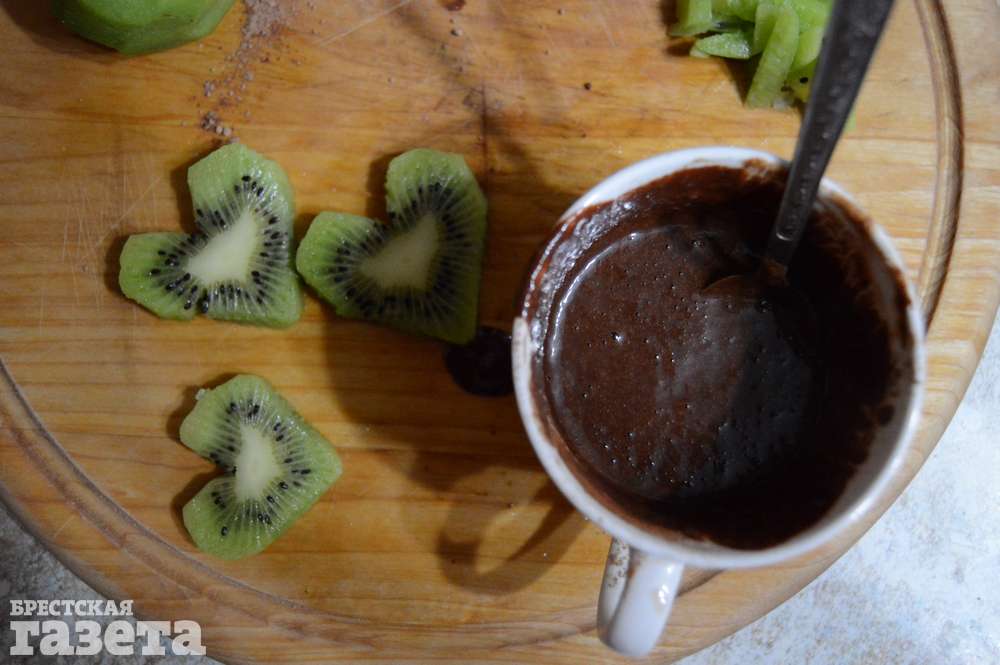 Приготовьте шоколадный соус. Для этого смешайте какао, молоко и мед в небольшой емкости и отправьте в микроволновку на 1 минуту при максимальной мощности.
