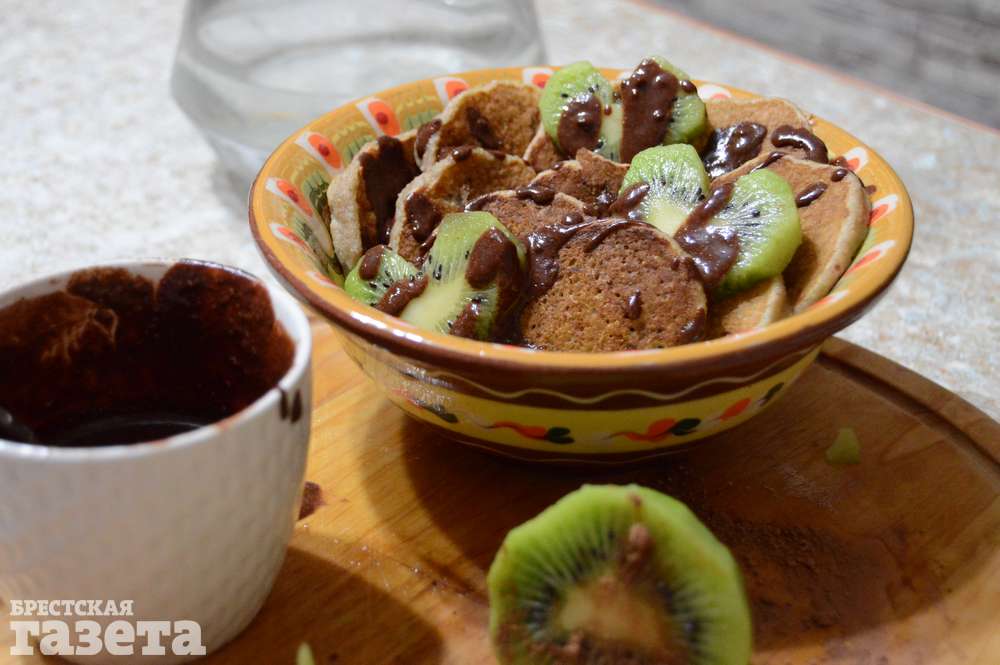 Готовые блинчики выложите на тарелку, украсьте любимыми фруктами и полейте соусом.