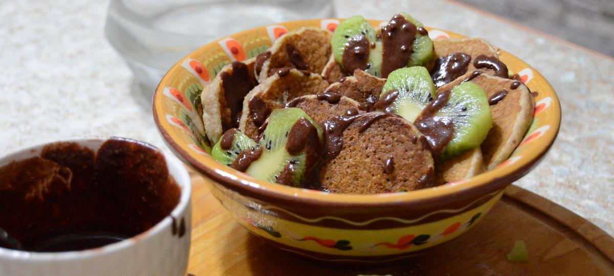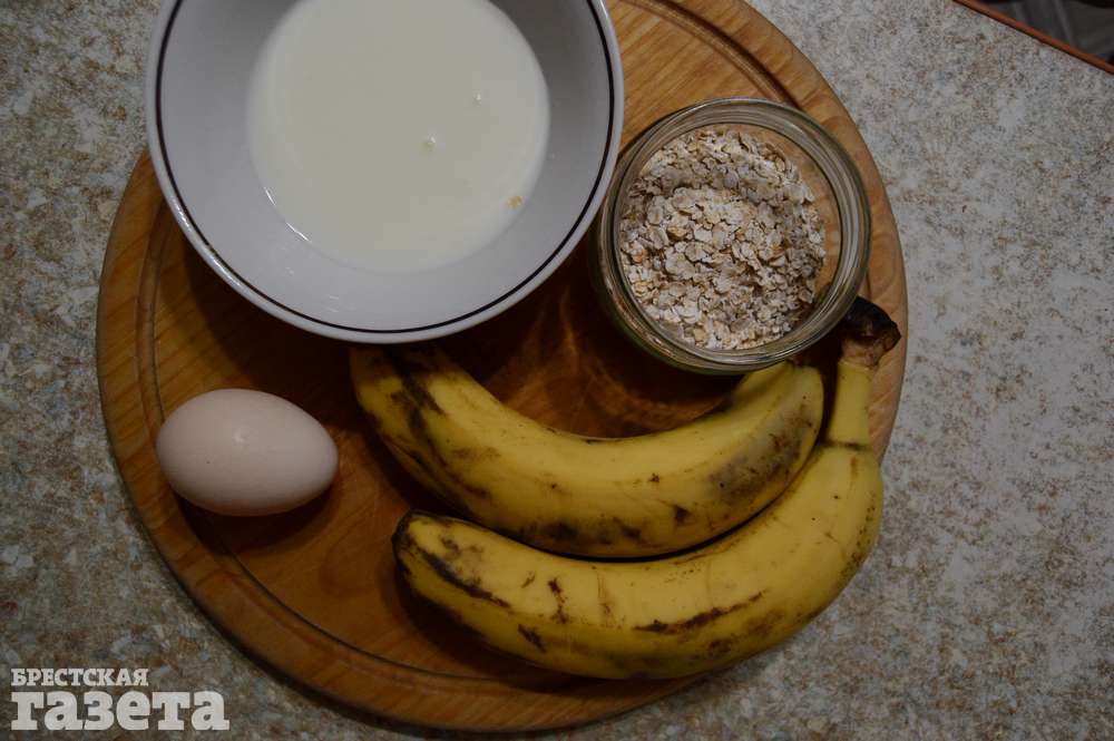 Надо: 2 очень спелых банана, 1 яйцо, 1/3 ст. овсяных хлопьев, 5 ст. л. греческого йогурта; для соуса: 2 ч. л. какао-порошка, 3 ст. л. молока, 1 ч. л. меда.