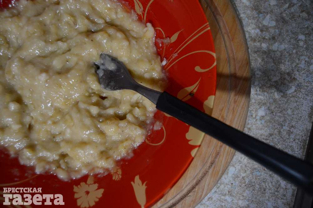 Бананы помните вилкой до состояния пюре. Вбейте туда яйцо, добавьте йогурт и перемешайте до однородной массы. Всыпьте получившуюся овсяную муку и снова перемешайте. Дайте настояться около получаса, чтобы мука набухла.