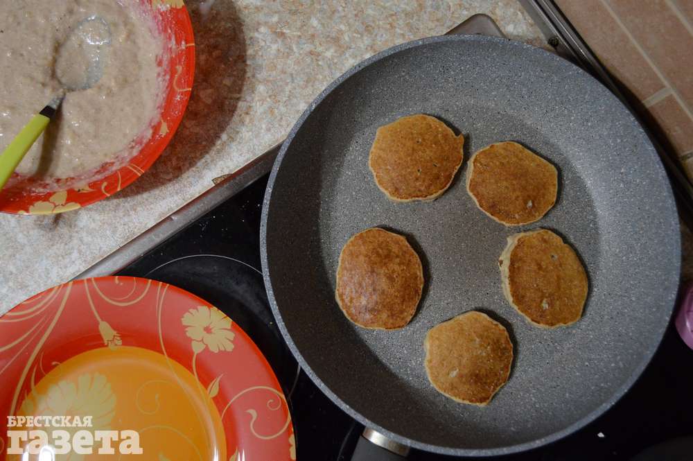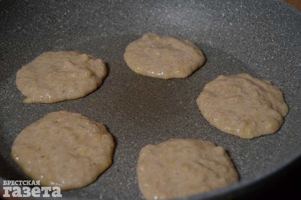 Хорошо разогрейте сковороду с антипригарным покрытием без добавления масла. Уменьшите огонь до среднего. Выкладывайте по одной столовой ложке с верхом теста на сковороду и жарьте блинчики сначала с одной стороны, а затем с другой.