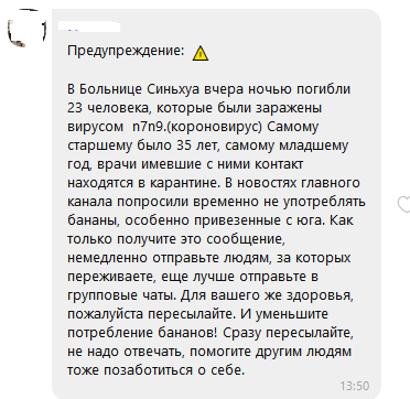 Есть еще один вариант сообщения: в нем указывается другая больница. Но не в этом дело. Первое, на что нужно обратить внимание, – название штамма вируса. В сообщении он неверный, коронавирус — 2019-nCoV, а не n7n9. Во-вторых, данное заболевание передается воздушно-капельным путем и не способно выжить за пределами организма. Кроме того, ни один специалист еще не связывал заболевание с продуктами питания, в частности, с фруктами.