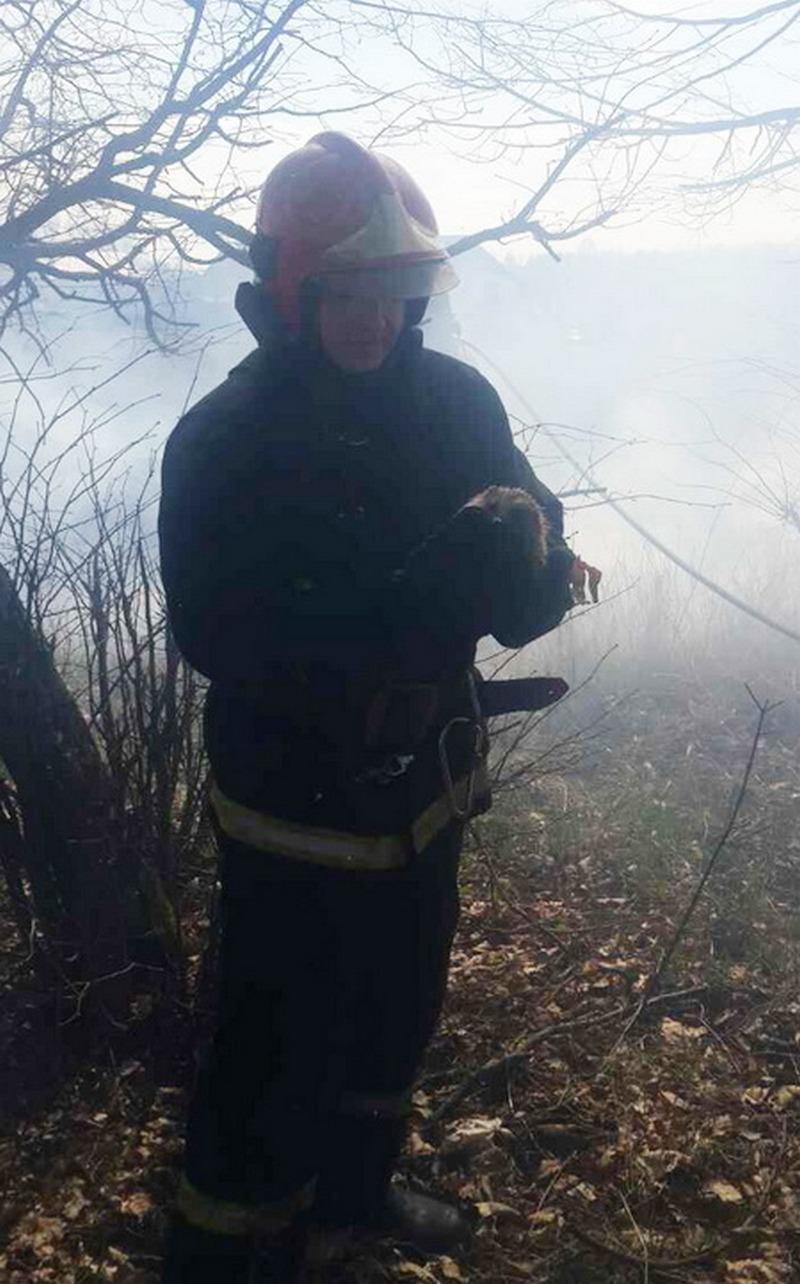 Во время ликвидации пожара один из спасателей заметил в траве ежа. Огонь почти подобрался к животному.