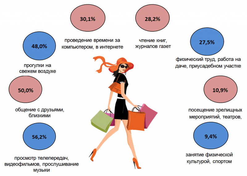 Белоруски предпочитают отдыхать, просматривая телепередачи, видеофильмы и слушая музыку (56,2%), общаясь с друзьями (50%), совершая прогулки на свежем воздухе (48%). Компьютер и интернет для отдыха используют 30,1% женщин, читают книги и журналы – 28,2%, трудятся на даче или приусадебном участке – 27,5%, посещают зрелищные мероприятия, театры и кино – 10,9%, физкультурой и спортом занимаются лишь 9,4%.