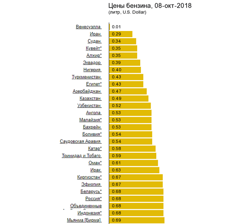 В некоторых других постсоветских государствах топливо дешевле. В Туркменистане оно стоит всего 43 цента, в Азербайджане — 47, в Казахстане — 48, в Узбекистане — 53.