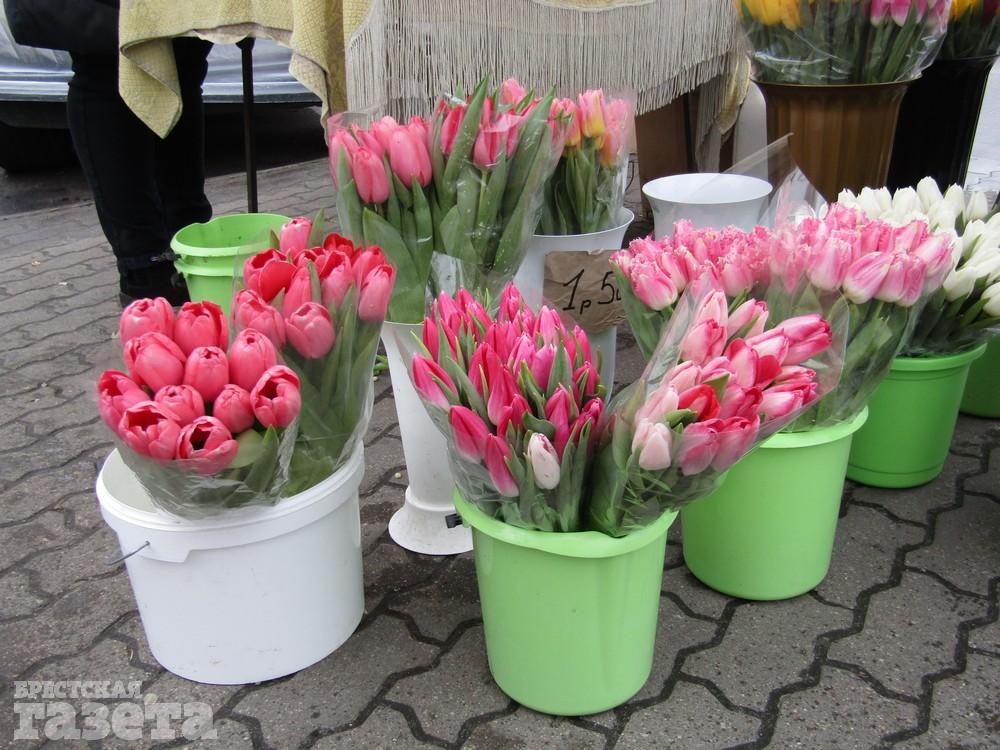Торговцы цветами возле Брестского рынка продают в основном тюльпаны. Пока не видно ни мимоз, ни хризантем.