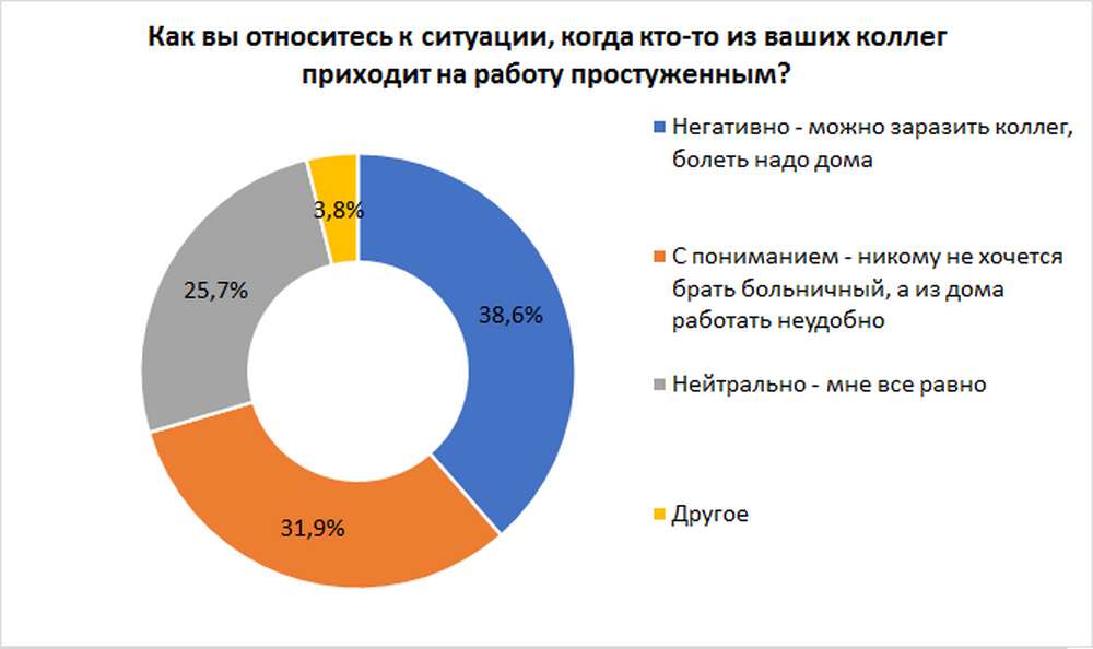А если на работе рядом с вами находится заболевший сотрудник? Ответы на этот вопрос не показали существенной разницы среди тех, кто негативно относится к такой ситуации — 38,6%, и тех, кто с понимаем воспринимает простывших коллег — 31,9%. Ведь, как отмечают респонденты, работать из дома неудобно, а больничный брать не хочется. Другие 25,7% опрошенных нейтрально относятся к простудным заболеваниям коллег.