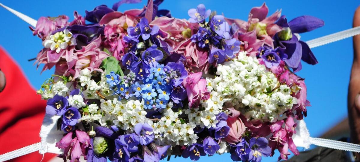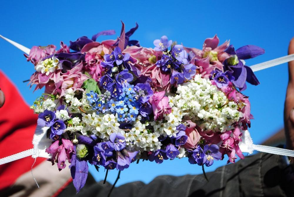 Работа заняла больше часа. Нужно было подобрать цветы, сорвать, закрепить, предварительно сделав в маске отверстия. Изделие украсили спирея серая, спирея сливолистная, синюха, дицентра миниатюрная, два сорта княжика и незабудка. Расположились они не в случайном порядке, а с соблюдением задуманной композиции.