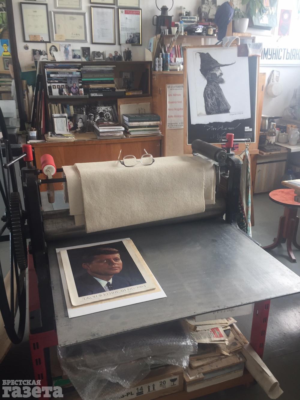 Лев Борисович назначил мне встречу в своей мастерской в многоэтажке на брестской набережной. Арендуемая мансарда с видом на Мухавец стала творческой базой мастера еще 20 лет назад. В центре – «кормилец» – офортный станок мастера. Алимов убежден, что у художника должна быть своя мастерская, а тот, кто рисует на кухне, занимается, скорее, хобби, а не искусством. Приятным музыкальным фоном для нашего разговора послужили композиции американского певца Фрэнка Синатры.