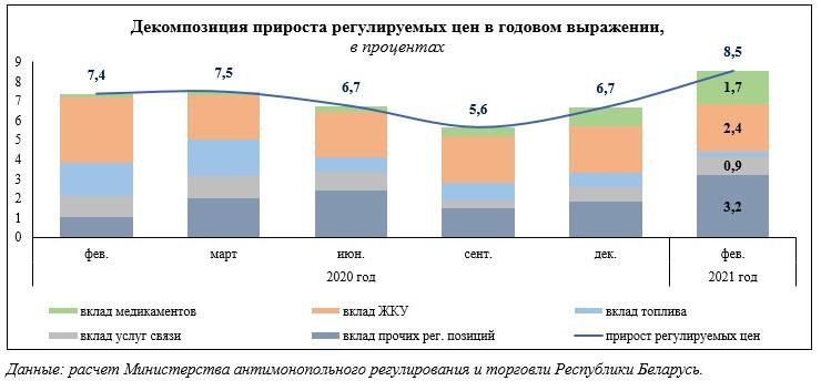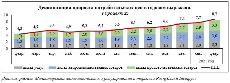 В начале весны Евразийский банк развития сделал неутешительный прогноз для жителей Беларуси. Так, если на 2021 год правительство и Нацбанк Беларуси запланировали инфляцию не выше 5%, то, по оценкам ЕАБР, инфляция в стране останется в диапазоне 8-8,5% год к году в феврале-марте и сохранится выше 7% год к году до октября 2021 года.