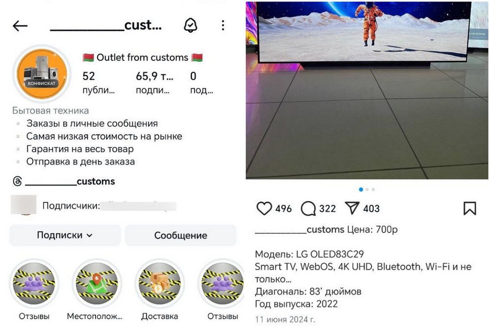 «Хотели купить телевизор и нарвались с мужем в инсте на магазин бытовой техники «по самым низким ценам». Аккаунт заманивает сладкими ценами, гарантируя, что товар является купленным конфискатом у таможенников. Картинки со склада похожи на реальность, не подкопаешься. Куча подписчиков, люди готовы выкладывать свои деньги за телевизоры, «айфоны» и прочую технику», — говорит беларуска.