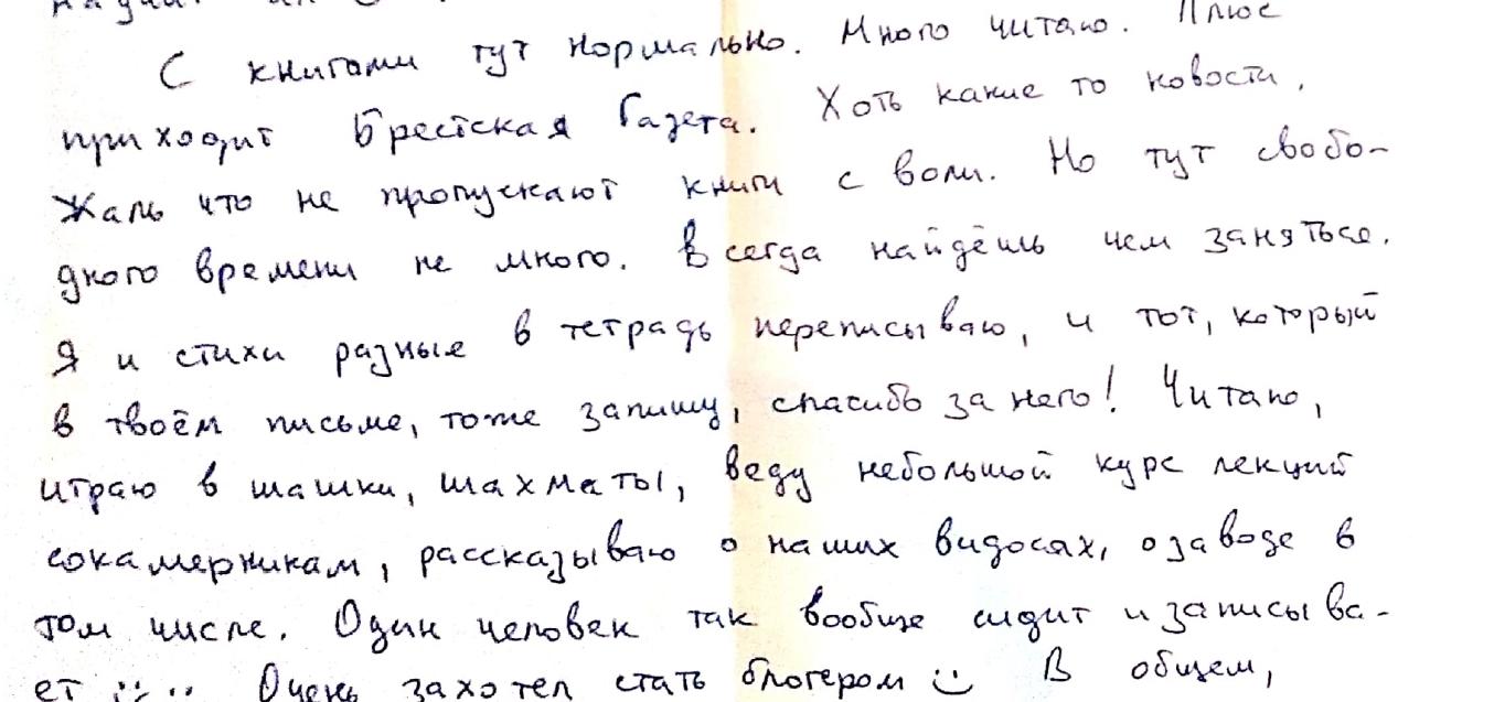 О том, чем еще занимается активный блогер в неволе, можно узнать из этого отрывка письма.