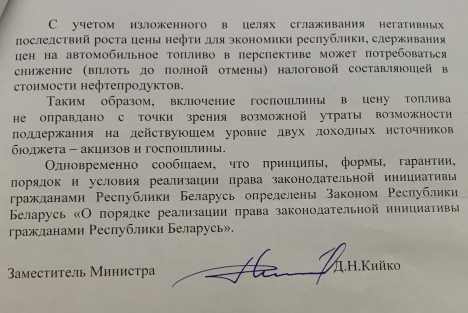 «Уважаемый Александр Григорьевич! Обратиться к Вам меня побудил и шокировал ответ Министерства финансов на мое предложение к проекту Указа Президента РБ по уплате транспортного сбора (налога, пошлины или плату за допуск к участию в дорожном движении), как его не назовешь. Суть одна.