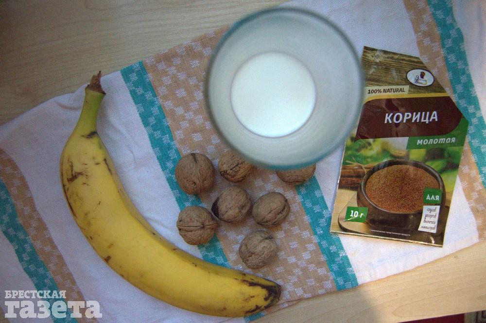 Надо (на 1 порцию): 1 банан, 70 г молока, 5-6 грецких орехов, 1 ч. л. корицы.