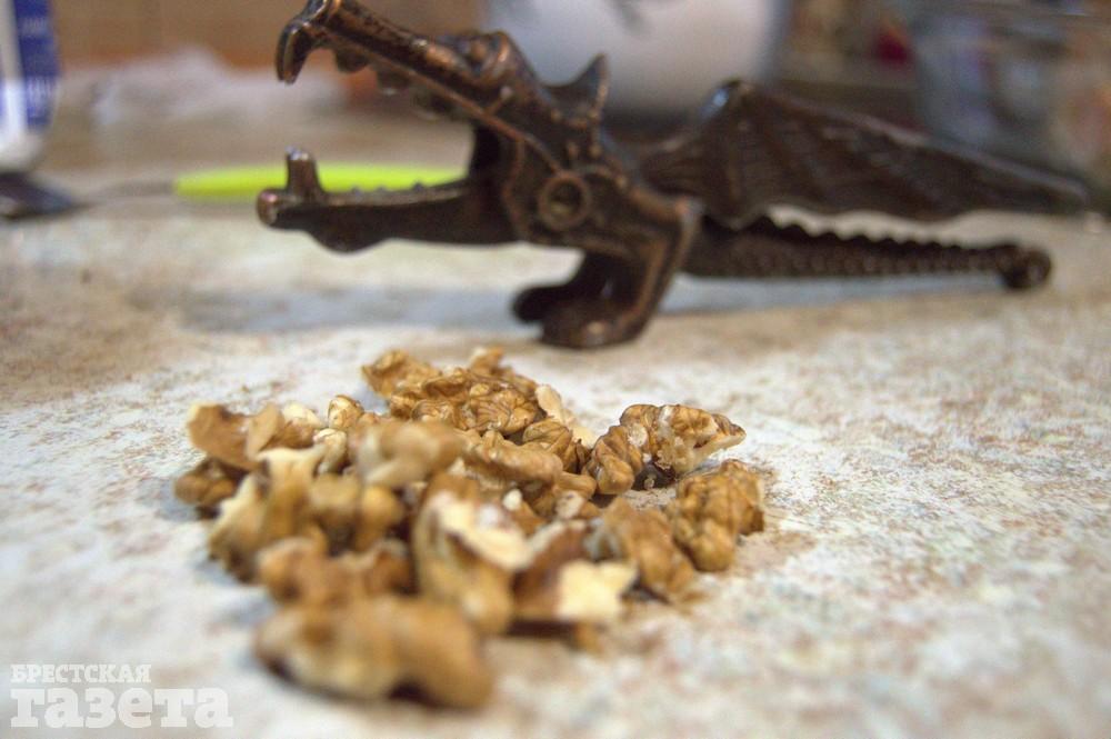 Пока готовится банан, очистите грецкие орехи и немного размельчите их при помощи ступки.