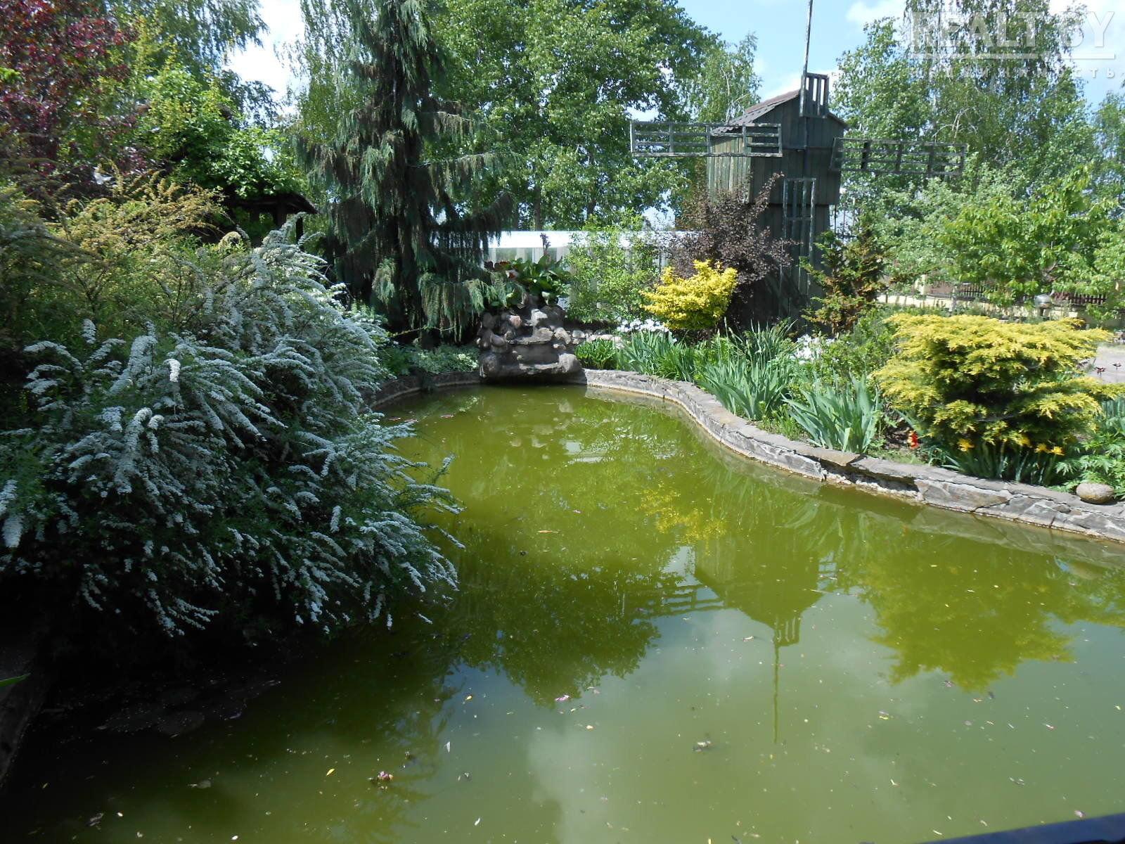 На территории есть водоем, беседка с барбекю, а также два гаража — один встроенный на 2 автомобиля, другой — отдельно стоящий также на две машины.