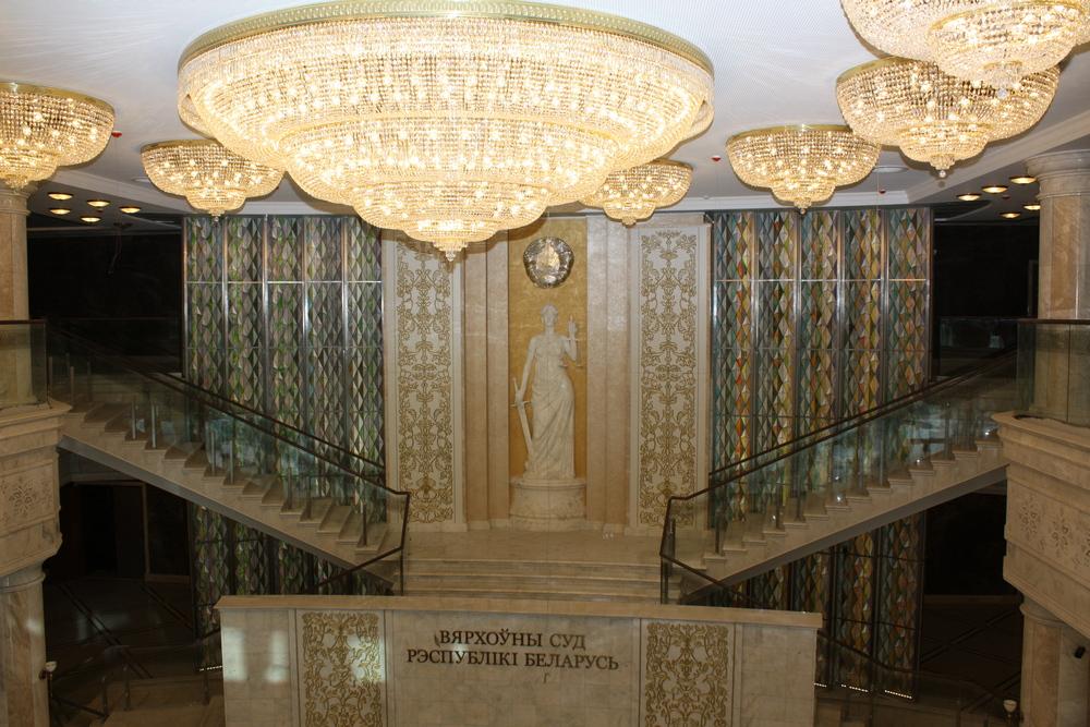 Напомним, новое здание Верховного суда находится в престижном столичном районе возле Дворца Независимости. По информации realty.tut.by, общая сметная стоимость всех работ — 166 миллионов рублей. Например, герб и надпись: «ВЯРХОЎНЫ СУД РЭСПУБЛIКI БЕЛАРУСЬ» для фасада стоят больше 112 тысяч долларов. Также у завода «Каскад» для холла главного входа закупили хрустальную люстру индивидуального изготовления почти за 90 тысяч долларов. Нашлись среди тендеров закупки на поставку художественных изделий более чем за 800 тысяч долларов и обустройство фонтана с освещением почти за 300 тысяч долларов.