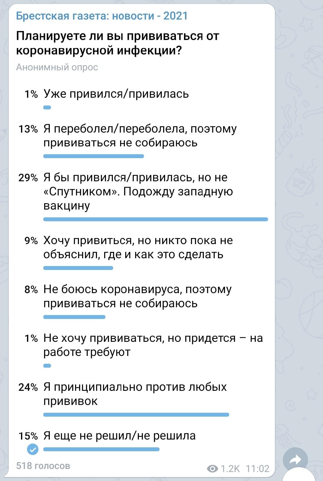 На днях «БГ» провела опрос о вакцинации на своих страницах в социальных сетях — Instagram и Telegram. Своим подписчикам мы задали один-единственный вопрос: «Планируете ли вы прививаться от коронавирусной инфекции?» — и предложили на выбор варианты ответов. В Telegram их было восемь, а в Instagram (из-за отсутствия технической возможности сделать больше) — четыре. При этом, и в том, и в другом случае мы не стали предлагать однозначный вариант ответа — «нет». Подписчики это заметили и, судя по комментариям, некоторые из них ответили бы именно так.