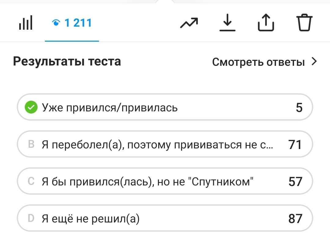В опросе в Instagram-сторис за сутки участие приняли 220 человек. Большинство из них — 43,5% или 87 человек — еще не решили, будут ли прививаться. 71 проголосовавший (35,5%) не собираются вакцинироваться, поскольку уже переболели. На третьем месте по популярности оказался вариант «Я бы привился/привилась, но не «Спутником»: его выбрали 57 человек или 28% от общего числа. Меньше всех голосов в Instagram набрал ответ «Уже привился(лась)» — так ответили 5 человек или 2,5% от всех участников опроса. Еще около 5 человек прислали сообщение, что выбрали бы ответ «Нет, не собираюсь прививаться от коронавирусной инфекции, если бы такой был предложен.