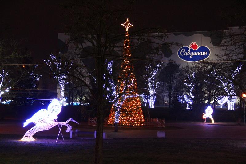 Яркий акцент новогоднего убранства этого года — хэштег #Савушкин_поздравляет. Конструкция «фотогенична» днем и по-особенному интересна ночью благодаря специальной подсветке с разных сторон.