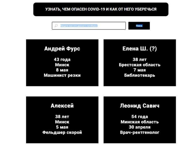 На сайте есть карточки со сведениями об умерших от коронавируса: возраст, биографические данные или воспоминания родных и друзей. При нажатии на карточки они раскрываются.