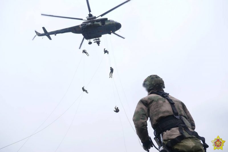 В рамках летно-тактического учения на полигоне «Брестский» беларуские военнослужащие сил специальных операций сегодня отработали элементы беспарашютного десантирования. В этом деле был задействован вертолет Ми-8МТВ-5, а для успешного приземления бойцы ССО использовали десантный канат и альпинистские веревки.