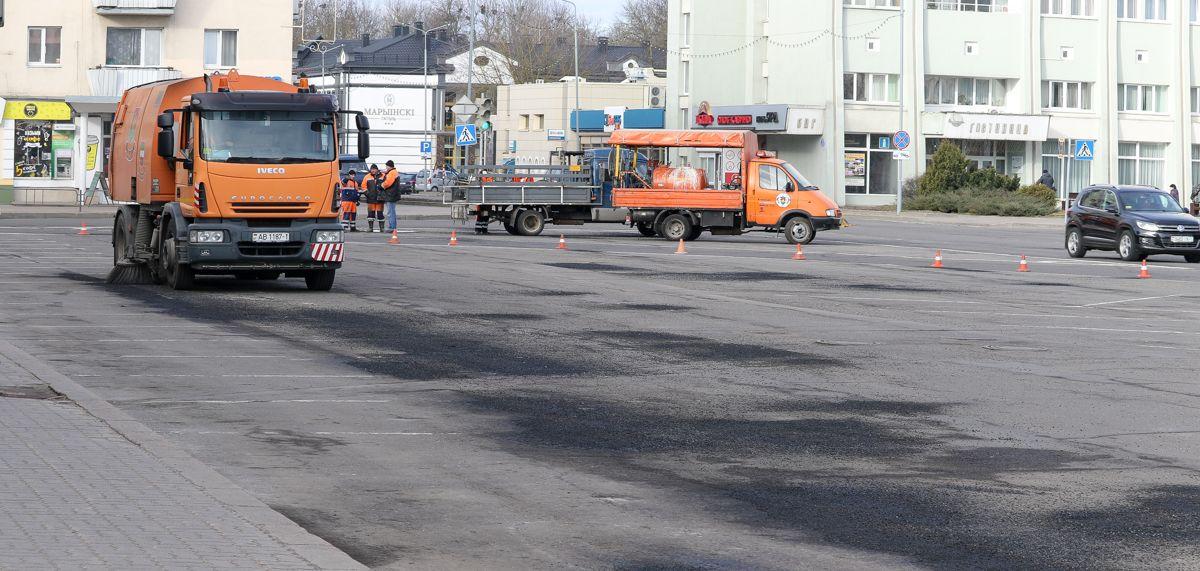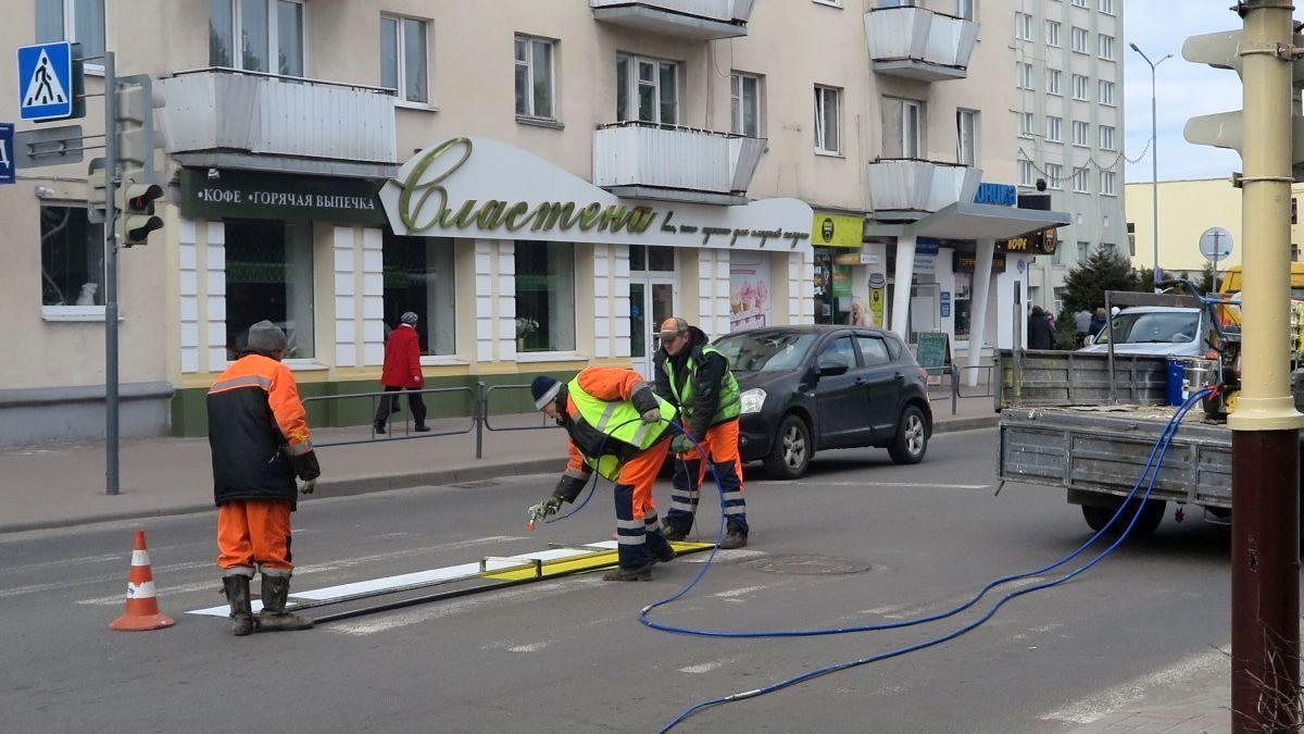 Днем 20 марта активнее всего велись работы в центре города. На дороги наносили новую дорожную разметку, красили столбы и заборы, мыли окна и козырьки зданий.