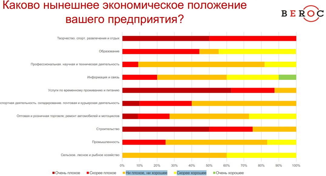 Половина опрошенных бизнесменов ответило, что экономическое положение бизнесов в сфере творчества, спорта, развлечений и отдыха — очень плохое. Еще 50% респондентов ответили, что положение дел там «скорее плохое». О нейтральности ситуации или возможном позитиве в экономике данных сфер не сказал ни один опрошенный.
