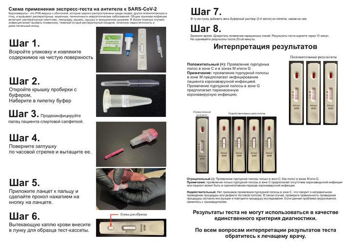 В комплект «Мульти Тест 010» входит тест-полоска, спиртовая салфетка, ланцет, буферный раствор, пипетка и пошаговая инструкция, где поясняется, как расшифровать результат: IgG означают, что в организме есть антитела, а IgМ — что человек болеет коронавирусом в данный момент.