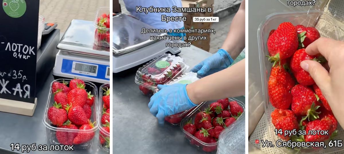 На днях в TikTok появилось видео, в котором супруги Настя и Алексей из деревни Замшаны Малоритского района продают клубнику в Бресте на улице Сябровская — по 35 рублей за килограмм. Небольшой лоток весом 400 грамм стоит 14 рублей.