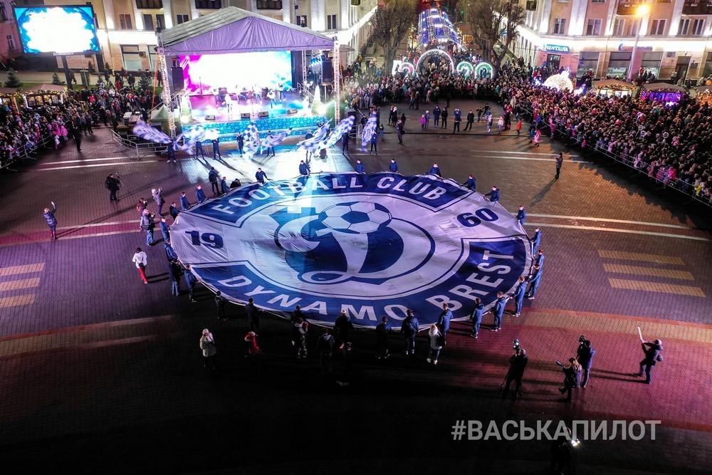 На верхушке елки — светящийся футбольный мяч в честь чемпионства брестского «Динамо».
