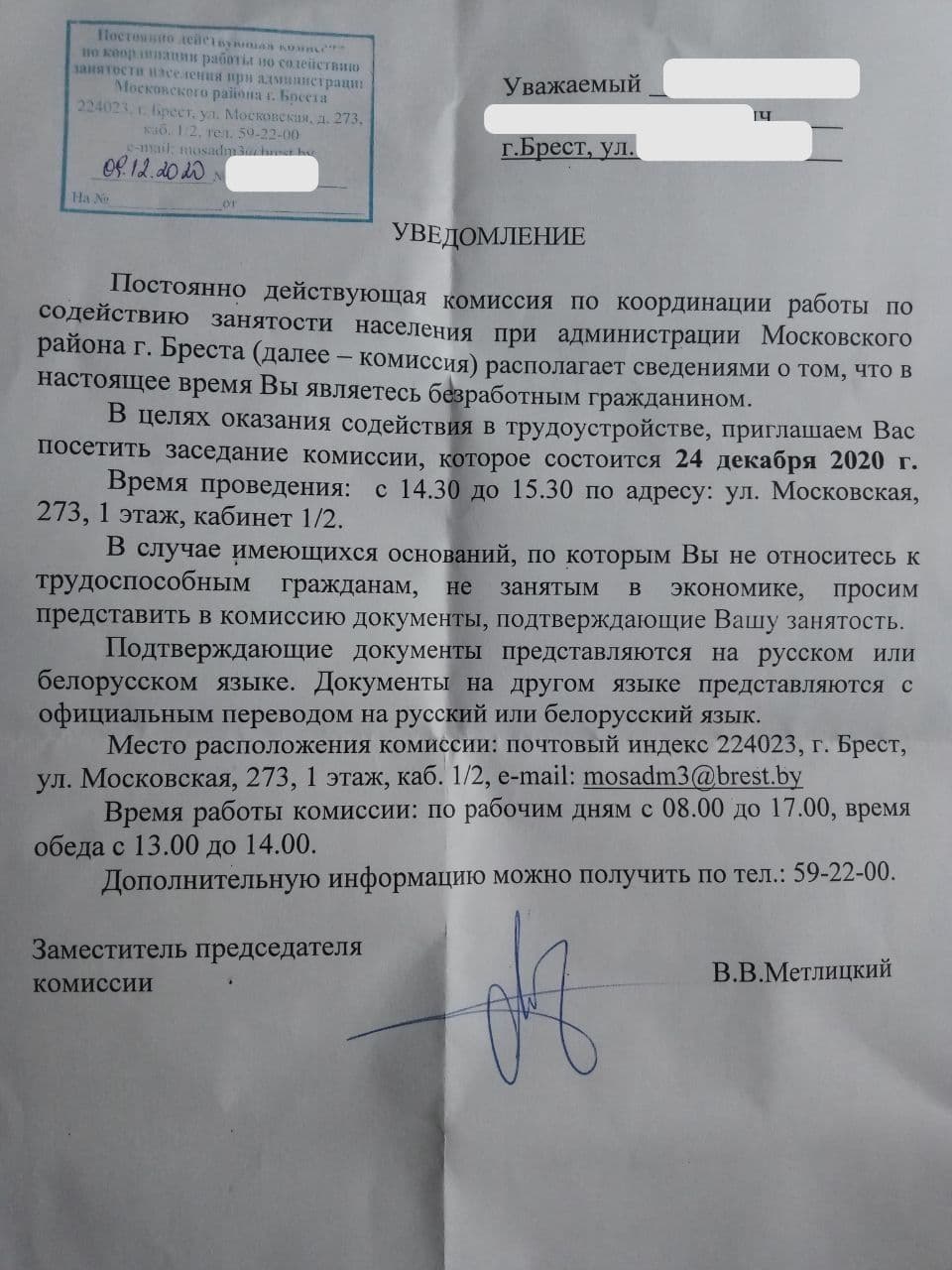 «Постоянно действующая комиссия по координации работы по содействию занятости населения при администрации Московского района г. Бреста располагает сведениями о том, что в настоящее время вы являетесь безработным гражданином. В целях оказания содействия в трудоустройстве, приглашаем вас посетить заседание комиссии, которое состоится 24 декабря», — говорится в письме.