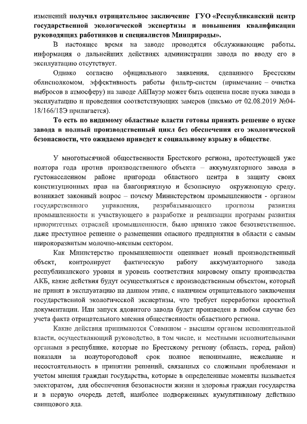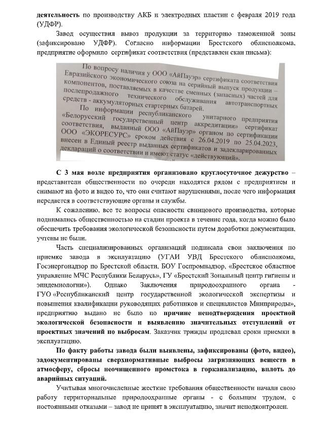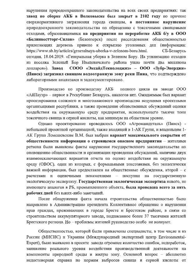 Речь в письме идет о нецелесообразности размещения свинцового производства в густонаселенном пригороде Бреста. Борцы с заводом аргументируют свою позицию и среди прочего пишут об абсурдности ситуации с санитарно-защитной зоной и указывают на то, что «не была проанализирована предыдущая деятельность Лемешевского В.М., бизнес которого связан со свинцовыми АКБ». Активисты обращают внимание и на то, что государственная экологическая экспертиза нового, не имеющего аналогов в РБ, промышленного объекта, была проведена всего за пять рабочих дней без каких-либо замечаний.