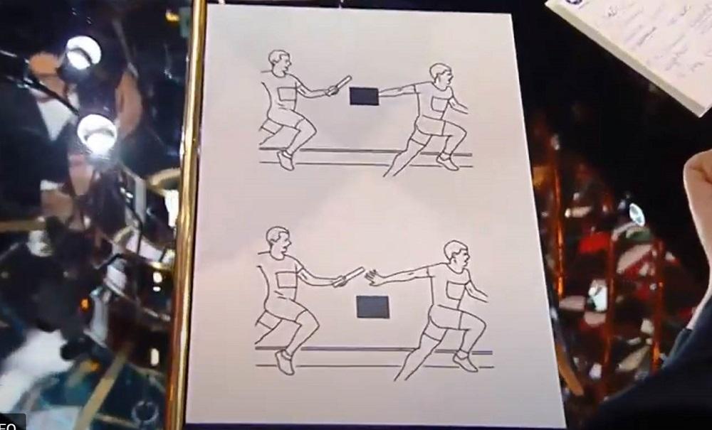 Василий Станчук попросил знатоков изучить карикатуру художника Tango. На ней изображен момент передачи эстафетной палочки от одного легкоатлета к другому. Один из нарисованных мужчин держит в руках какой-то предмет, а после приема палочки бросает его на землю. Василий Станчук закрасил этот предмет черным квадратом и попросил знатоков назвать его.