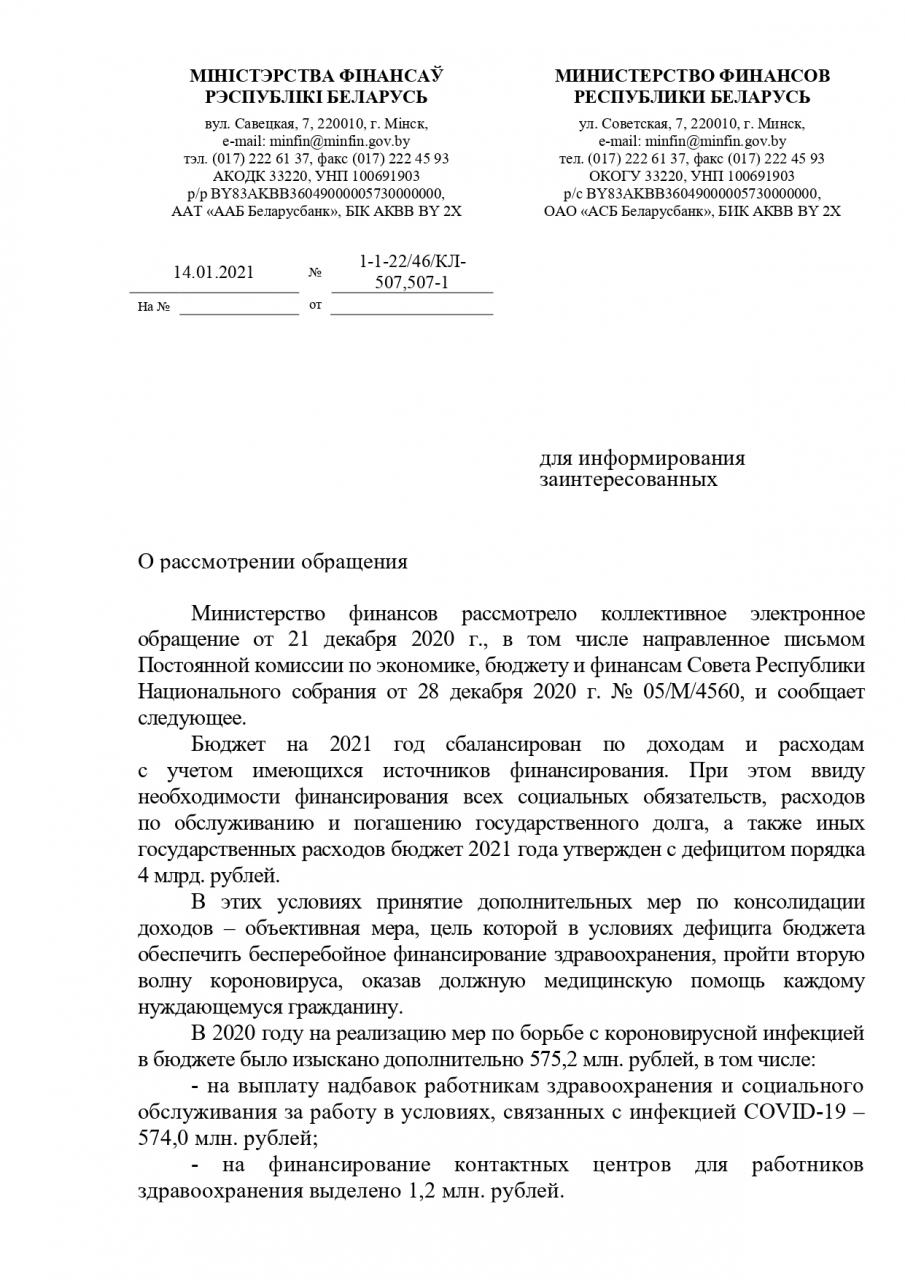 «Формирование заработной платы государственных служащих регулируется Трудовым кодексом, законом Республики Беларусь «О государственной службе в Республике Беларусь» и принятыми в соответствии с этим Законом иными актами законодательства. Изменение указанных нормативных правовых актов не входит в компетенцию Министерства финансов».