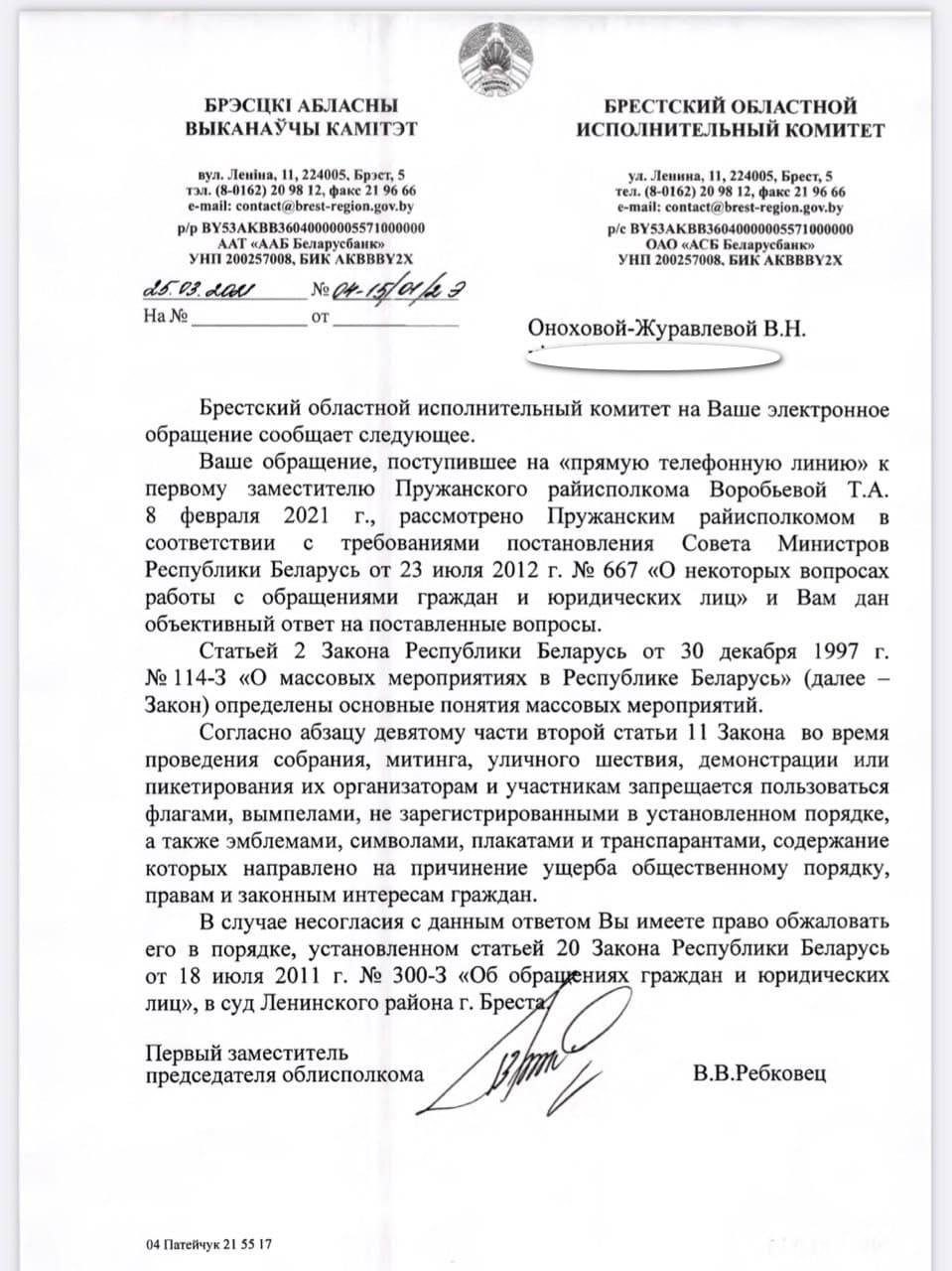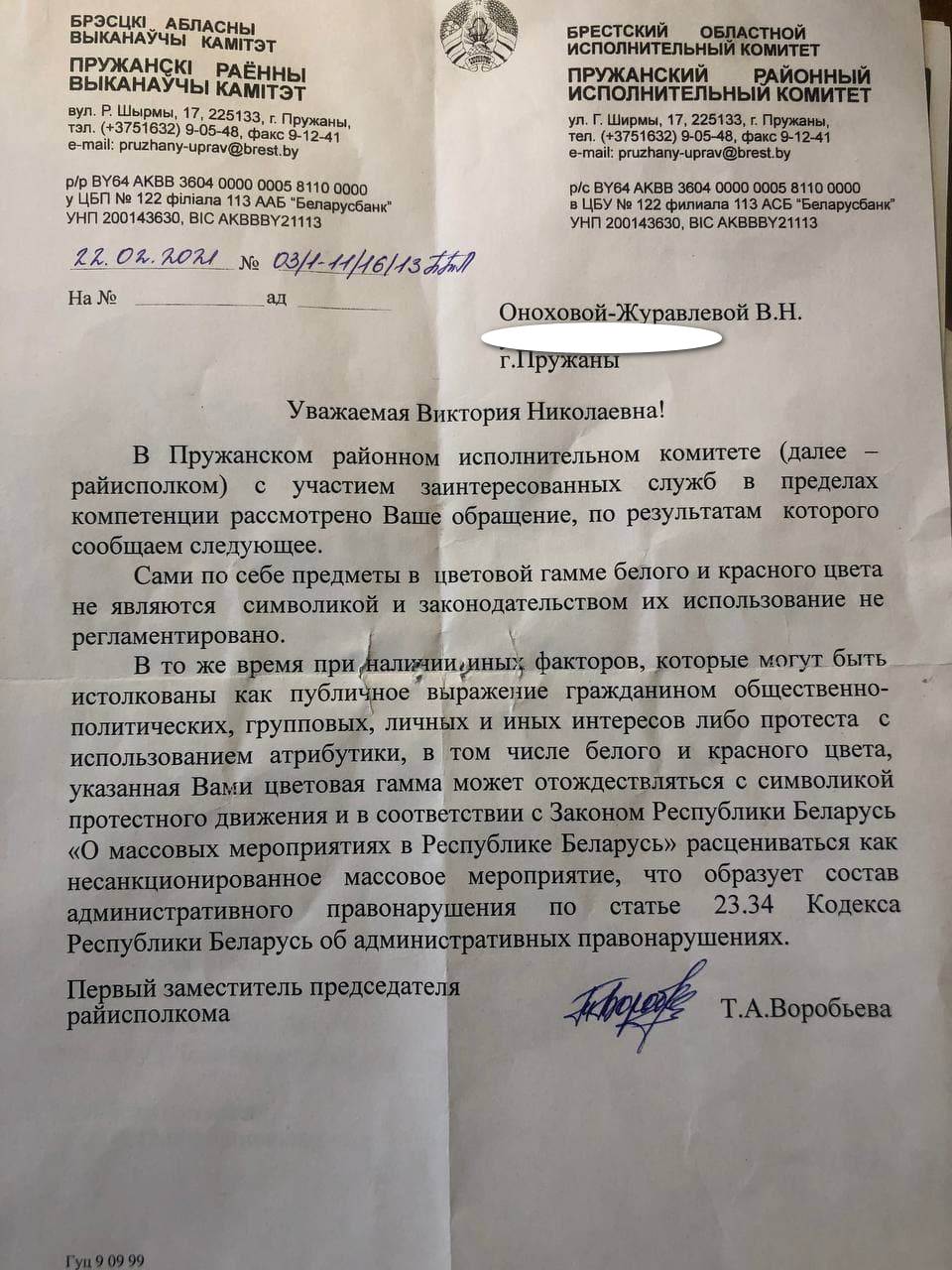 В ответе, который пришел после телефонной линии из райисполкома, говорилось, что само по себе использование белого и красного цветов законодательством не регламентируется, но в то же время при наличии иных факторов указанная цветовая гамма может быть расценена как несанкционированное массовое мероприятие. Никаких ссылок на законодательство, кроме упоминания закона о массовых мероприятиях, в письме указано не было. Поэтому Викторая Онохова-Журавлева обратилась в облисполком. В своем письме она перечислила пункты, в которых, по ее мнению, ответ Пружанского райисполкома не соответствует предъявляемым законом требованиям.