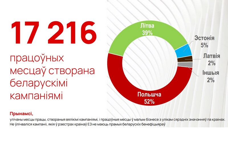 Беларуские компании в Евросоюзе создали более 17,2 тысяч рабочих мест. 52% из них созданы в Польше, 39% — в Литве, 5% — в Эстонии, по 2% — в Латвии и других странах ЕС.