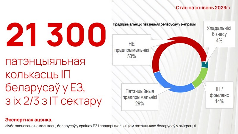 В то же время в Евросоюзе беларусы открыли 21 300 аналогов ИП, две трети которых работают в секторе IT. Однако больше половины из тех, кто оформил такой вид деятельности (53%), на самом деле не являются предпринимателями. Они либо работают на крупные фирмы, выбрав такой вид трудоустройства, либо являются безработными.