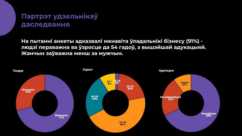 71% участников опроса — мужчины, 29% — женщины. Что касается их возраста, то лидирует возрастная категория 35-44 лет — 46% от всех опрошенных. 90% опрошенных имеют высшее или послевузовское образование.