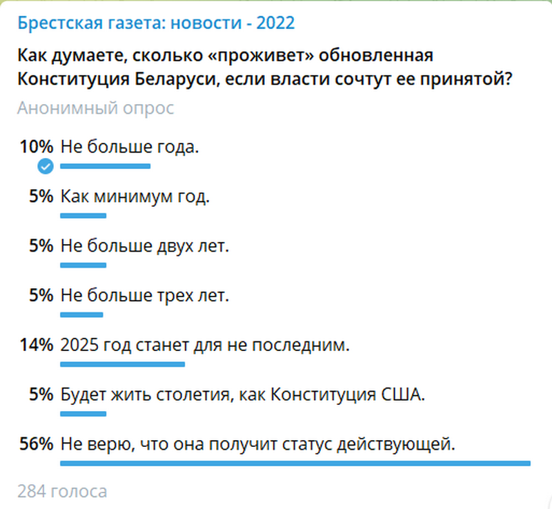 Сегодня впору заключать пари о том, как долго проживет обновленная Конституция Беларуси, если те, кто прихватизировал власть, решат объявить ее принятой. «Брестская газета» по этому поводу ни с кем пока пари не заключала, но решила спросить своих подписчиков в одном из мессенджеров, что они об этом думают.