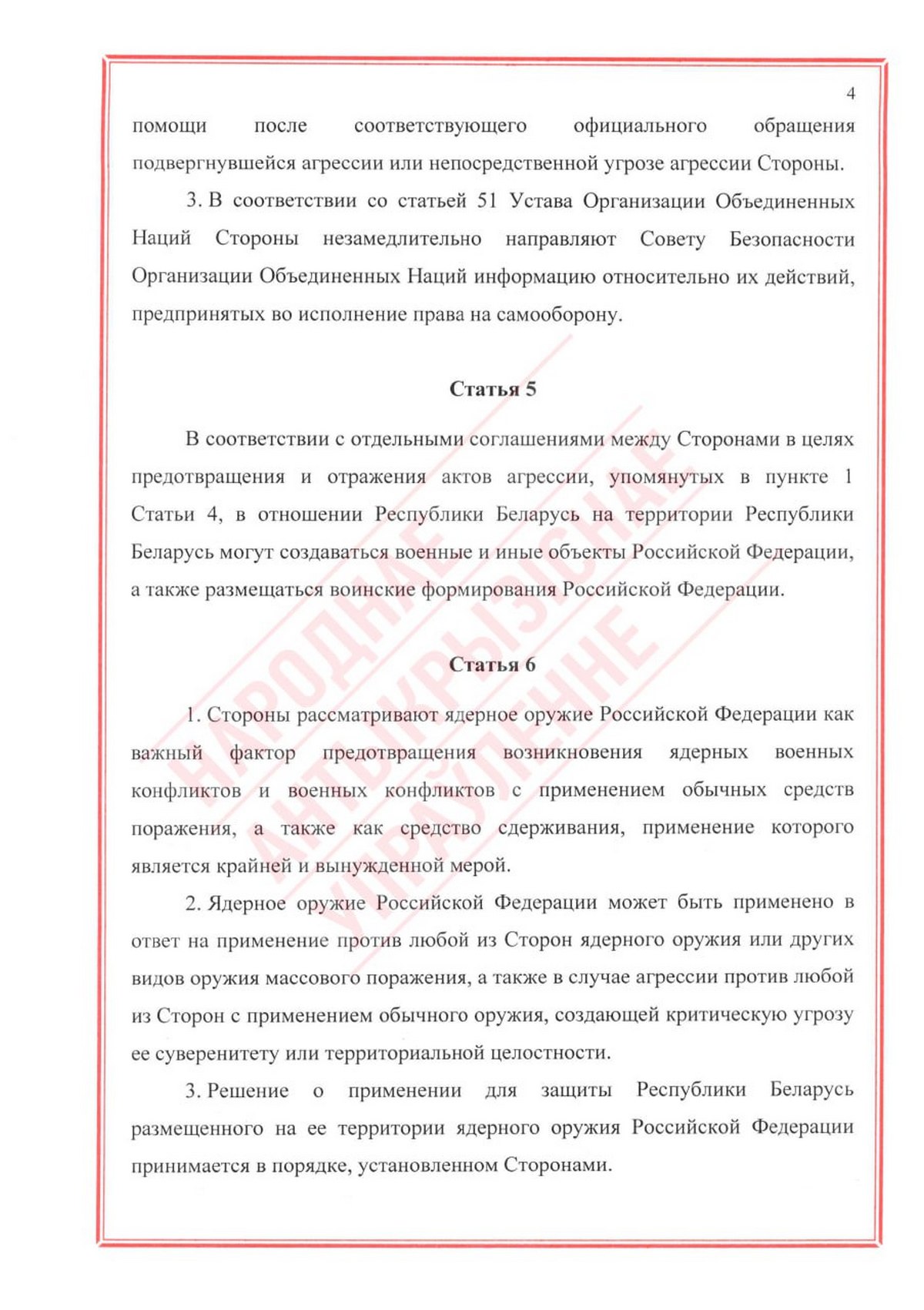Статья 6 оговаривает условия применения ядерного оружия, которое, если верить Лукашенко, уже находится на территории Беларуси.