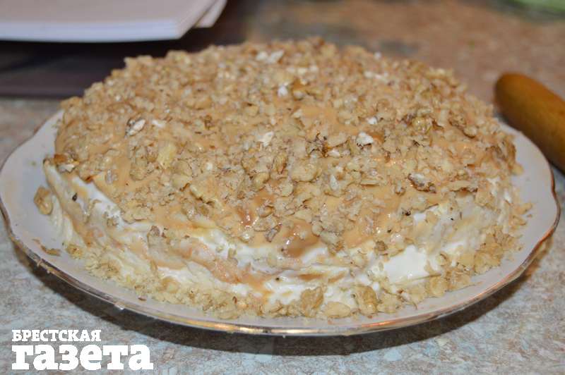 Верхний слой покройте сгущенкой, смешанной со сметаной, и посыпьте орешками.