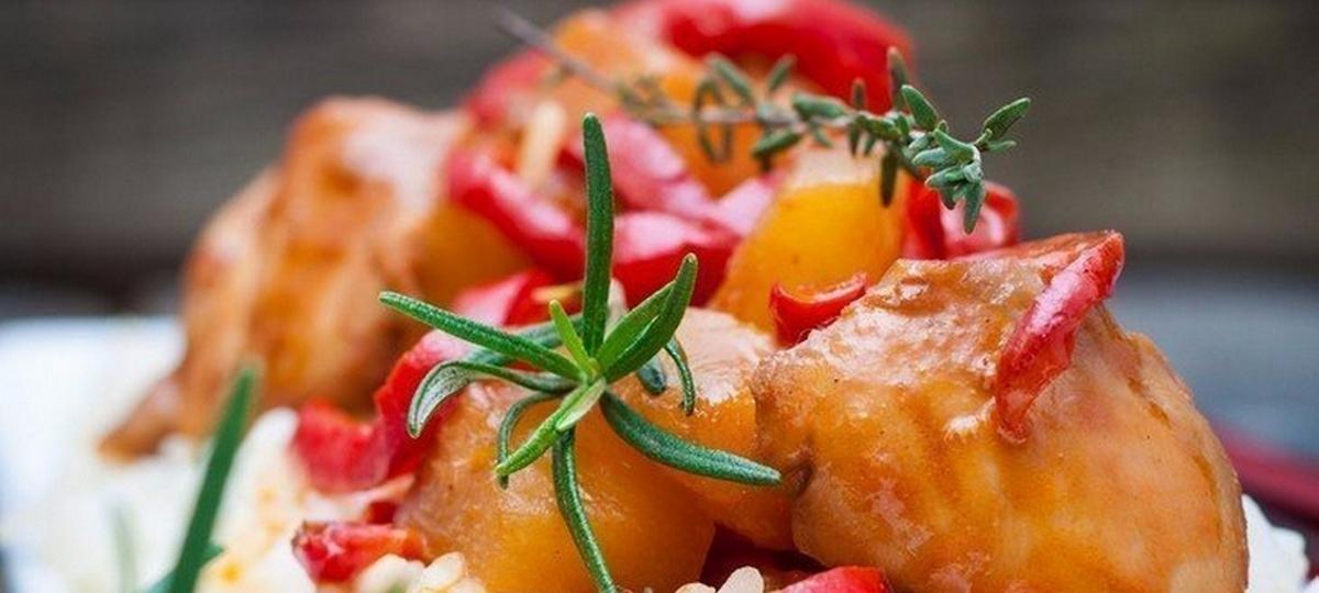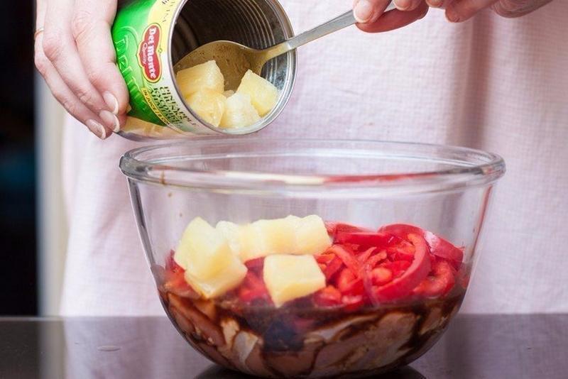 А также 5 ч. л. коричневого сахара, 2 ст. л. томатной пасты, 1 красный болгарский перец, 1 ст. консервированного кусочками ананаса.