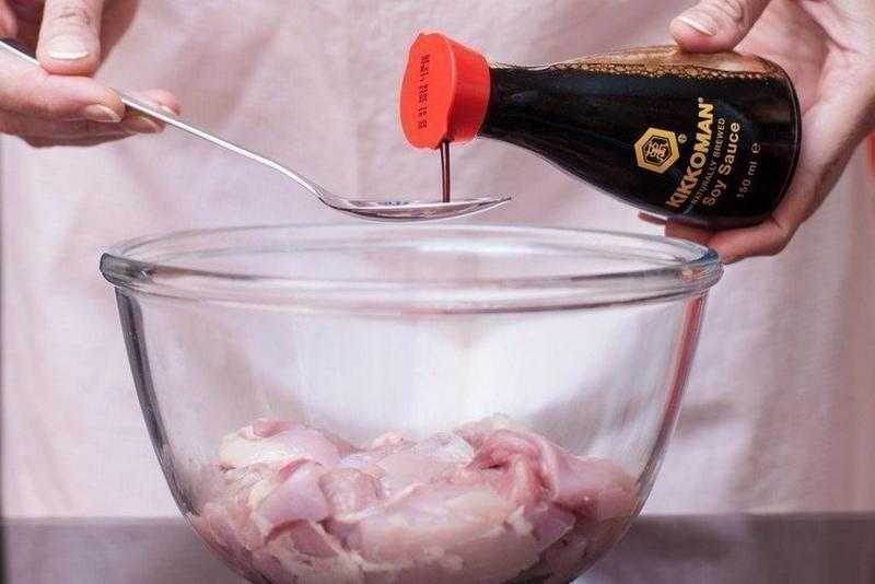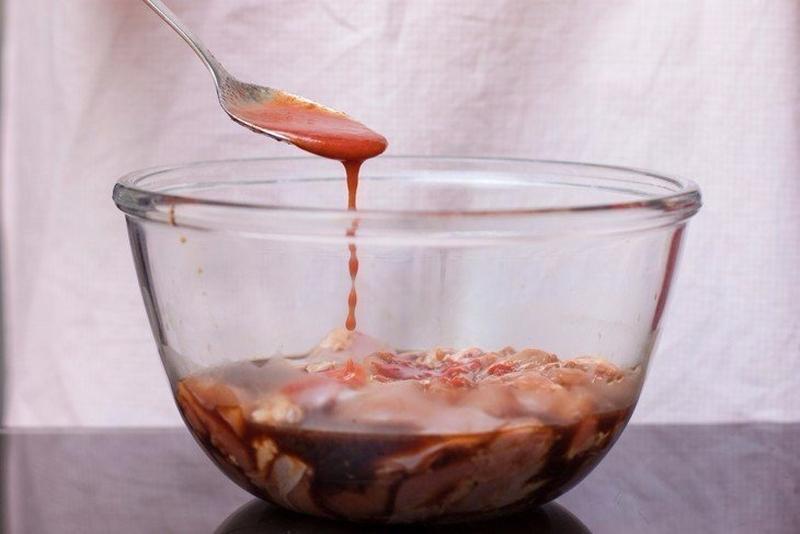 Готовим: Куриное филе нарежьте на небольшие кусочки, сложите в миску, влейте соевый соус. Добавьте томатную пасту, сахар и яблочный уксус.