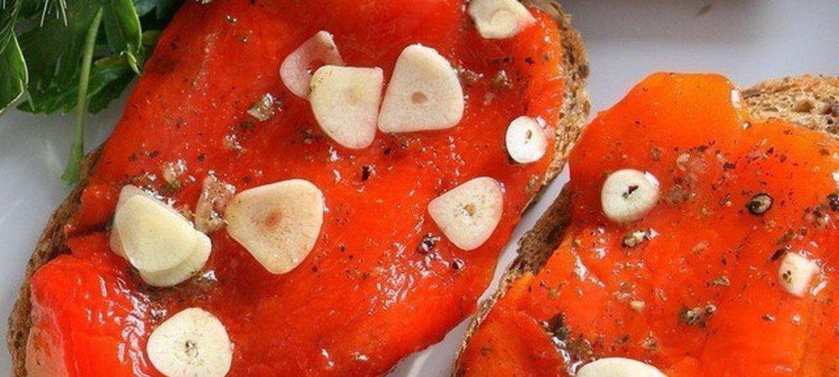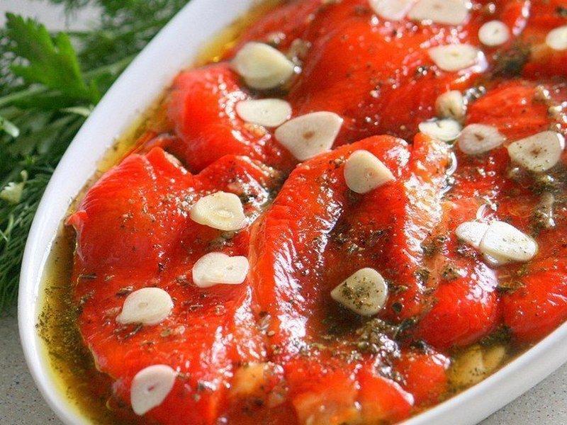 Надо: 4 больших болгарских перца, 4 зубчика чеснока, 1 ч. л. с горкой сушеного базилика, 1 ч. л. с горкой крупной соли, 1 ч. л. сахара, 6-7 горошин черного перца, 5 ст. л. оливкового масла, 1 ст. л. бальзамического уксуса, сок четвертинки лимона.